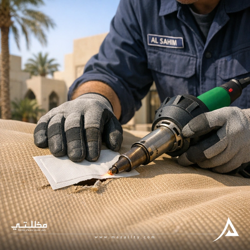 - التركيب والشد: تثبيت المواد الجديدة وضبط درجة الشد لمنع تراكم مياه الأمطار.