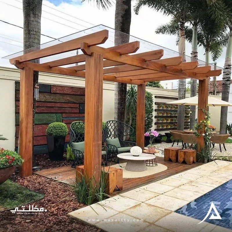 - زاوية جلوس هادئة تحت ظل الخشب الطبيعي.